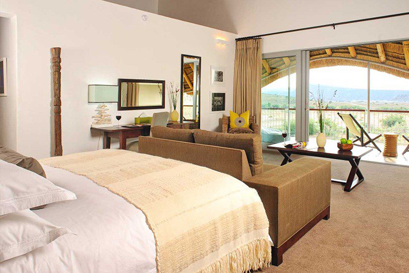 Kwena Lodge has 14 open plan suites that come with skylights, wooden fireplaces, and en-suite bathrooms with deep baths and walk-in showers. The suites open onto private patios overlooking two waterholes and the breathtaking Outeniqua Mountains. Suites are equipped with a mini bar, tea station, telephone and safe. King and twin bed options are available upon request.